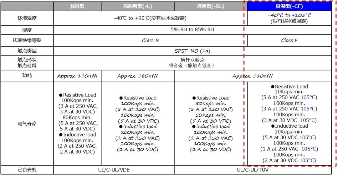 這款繼電器專為高溫應用而設計,能夠在高達105℃的環境中穩定運行。其具備5mm寬度(20×5.08×12.5mm)的緊湊設計,以及5A大分斷性能。此外,這款繼電器憑借僅110mW的線圈功耗,實現了高效節能。