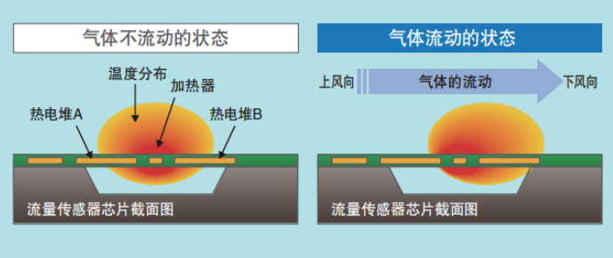 歐姆龍MEMS流量傳感器檢測原理:在沒有氣體流動的情況下以加熱器為中心,溫度分布左右對稱。流動的狀態(tài)下,加熱器上風(fēng)向的溫度低,下風(fēng)向溫度高,溫度分布不再對稱。將該溫差作為熱電堆的電動勢之差進行傳感,可測量流量、流速而不影響溫度、壓力。此外,熱電堆為熱電動勢方式,與電阻式相比,有助于降低功耗。