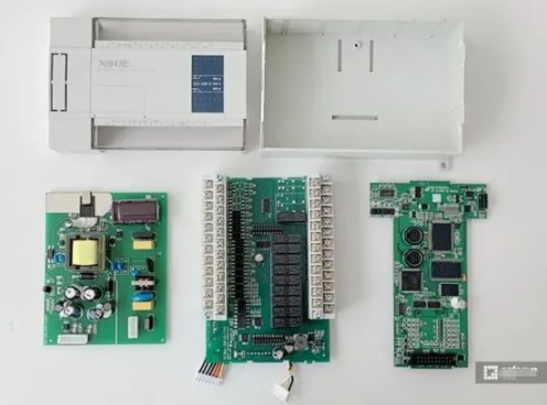 PLC 在 PCB 設(shè)計(jì)上分為了 3 個(gè)板子,從左至右分別為電源板、IO 口板以及主控板。