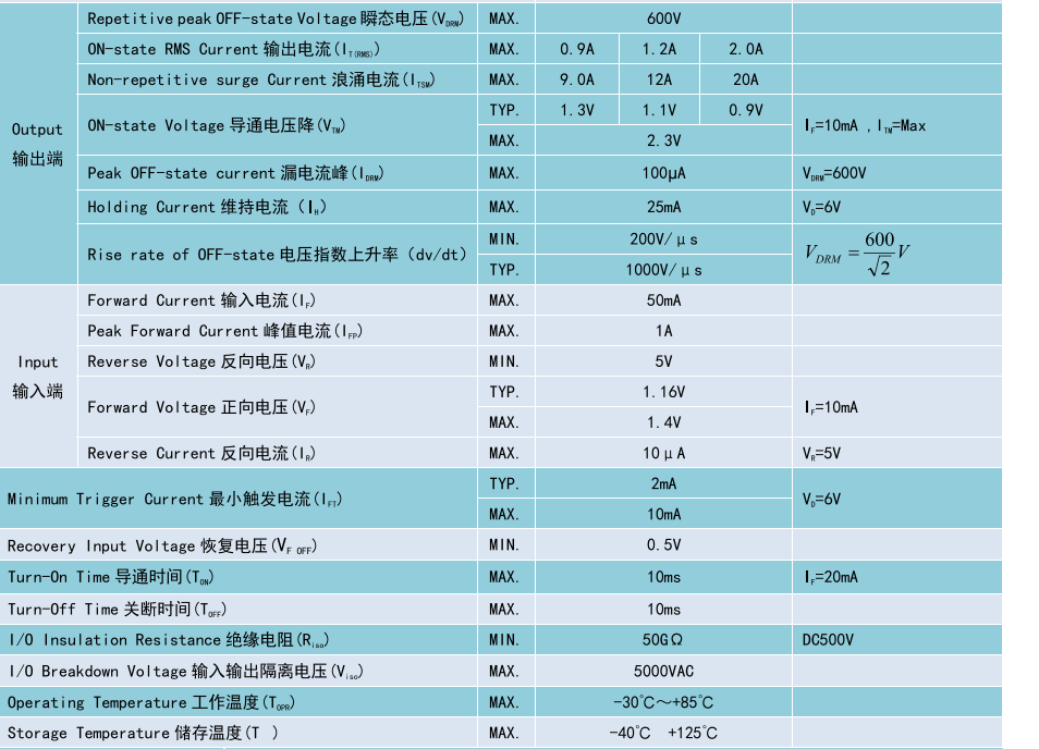 (Triac Relay 光可控硅繼電器 DIP7/SMD7),Product Model產品型號:BC2213/BC3213/BC5213,Contact Form觸點形式:1a(Zero-on 過零型),Ambient Temperatur 25'C,測試環境溫度 25℃℃