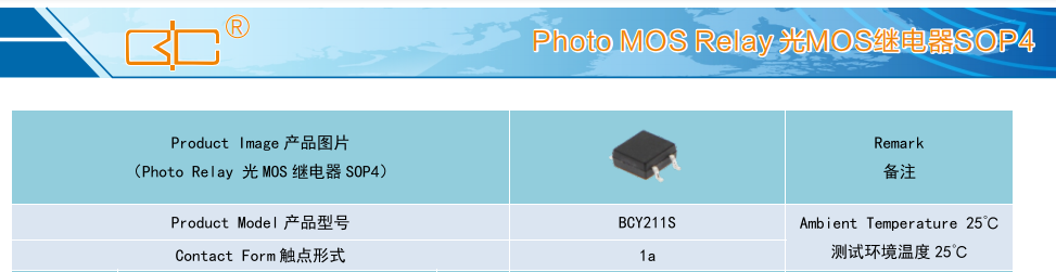 Relay 光MOS 繼電器 SOP4, Product Model產(chǎn)品型號(hào):BCY211S, Contact Form觸點(diǎn)形式:1a, Ambient Temperature 25C, 測試環(huán)境溫度 25℃C