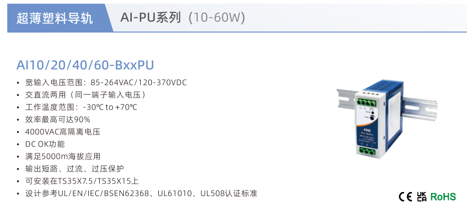 開關電源A110/20/40/60-BxxPU, ?寬輸入電壓范圍:85-264VAC/120-370VDC ?交直流兩用(同一端子輸入電壓) ?工作溫度范圍:-30°Cto +70℃℃ ?效率最高可達90% ?4000VAC高隔離電壓 ?DCOK功能 ?滿足5000m海拔應用 ?輸出短路、過流、過壓保護 ?可安裝在TS35X7.5/TS35X15上 ?設計參考UL/EN/IEC/BSEN62368、UL61010、UL508認證標準