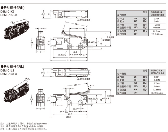 在針狀按鈕型中為了自由位置和總行程位置的數(shù)據(jù),在擺桿型中為總行程位置的數(shù)據(jù)。 接點(diǎn)的閉路或開(kāi)路在1ms以內(nèi)。 |
